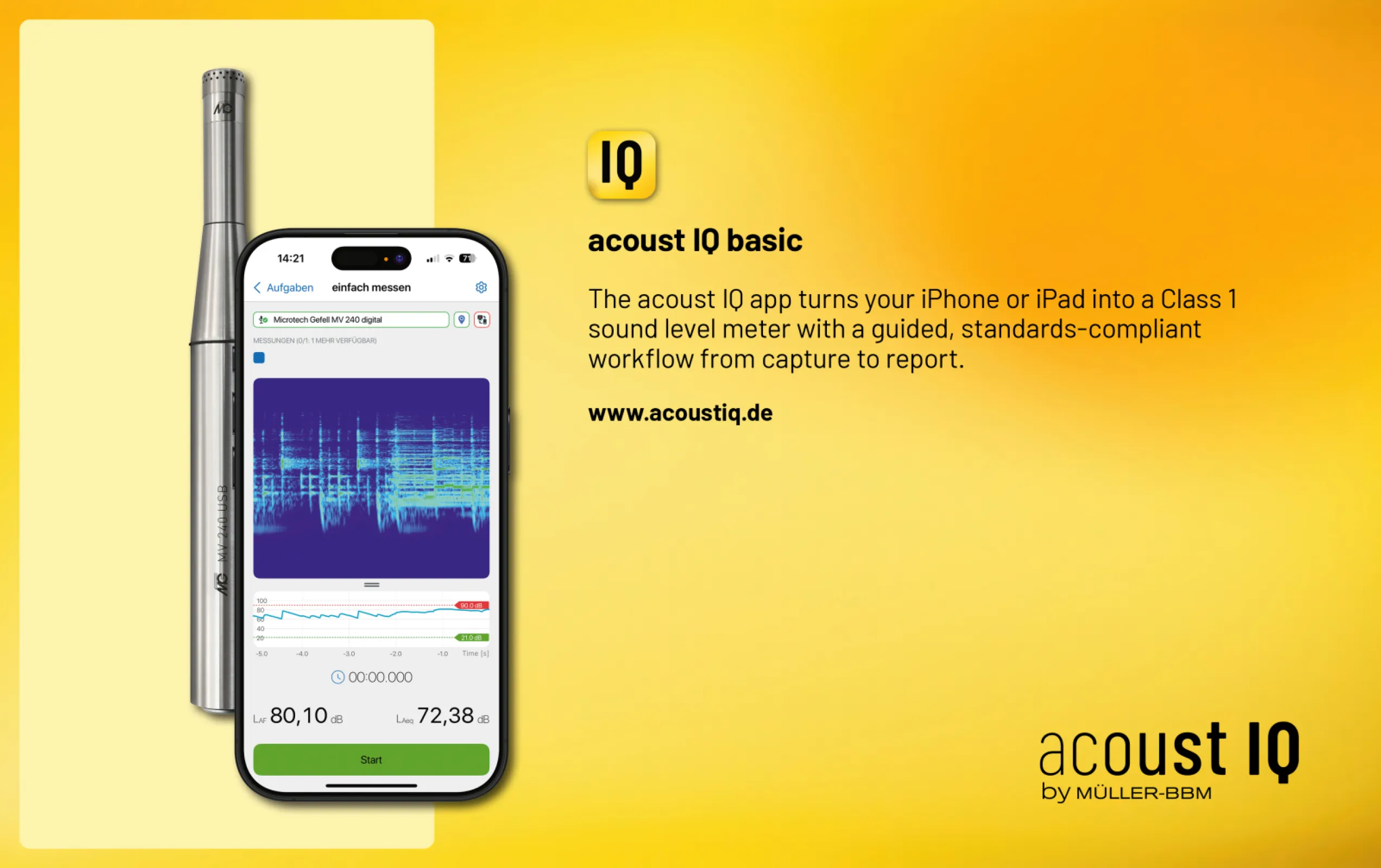 The acoust IQ-App turns an iPhone or iPad into a high-performance Class 1 sound level meter using a compatible external microphone. The app provides a guided, standards-compliant workflow from acquisition to documentation, including non-destructive editing, metadata capture (images, notes, GPS/Galileo, speech-to-text), template-based reporting, and seamless export. Designed for professional use in industry, environmental work, construction, and research.